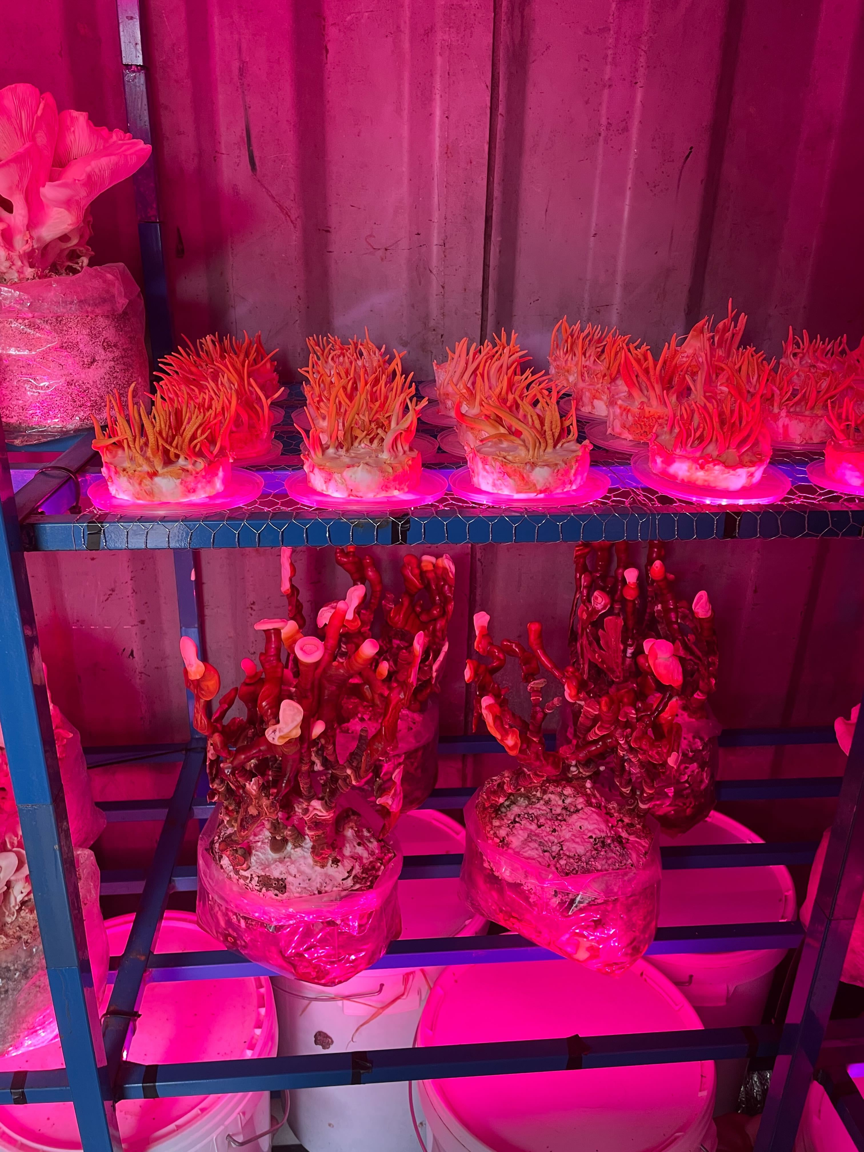 Jon Davies & Steve William, the designers behind this project, have added purple lights inside the container to highlight ten species of mushrooms - both edible and medicinal - from the beloved shiitake and oyster to varieties like reishi and lion's mane.